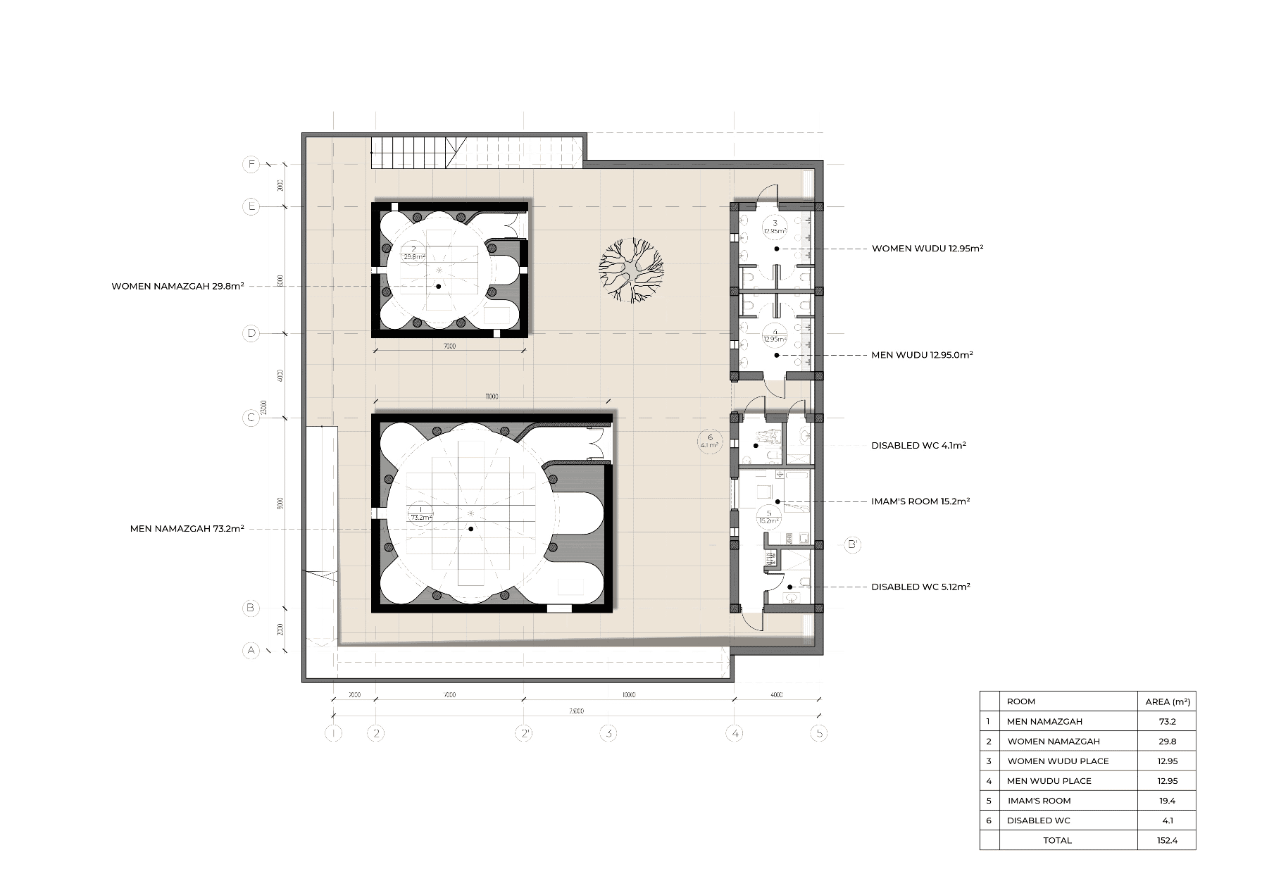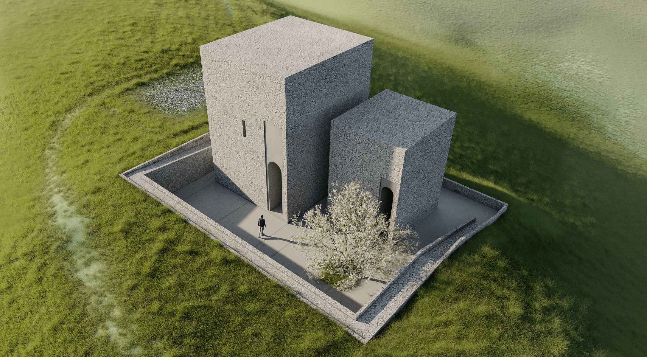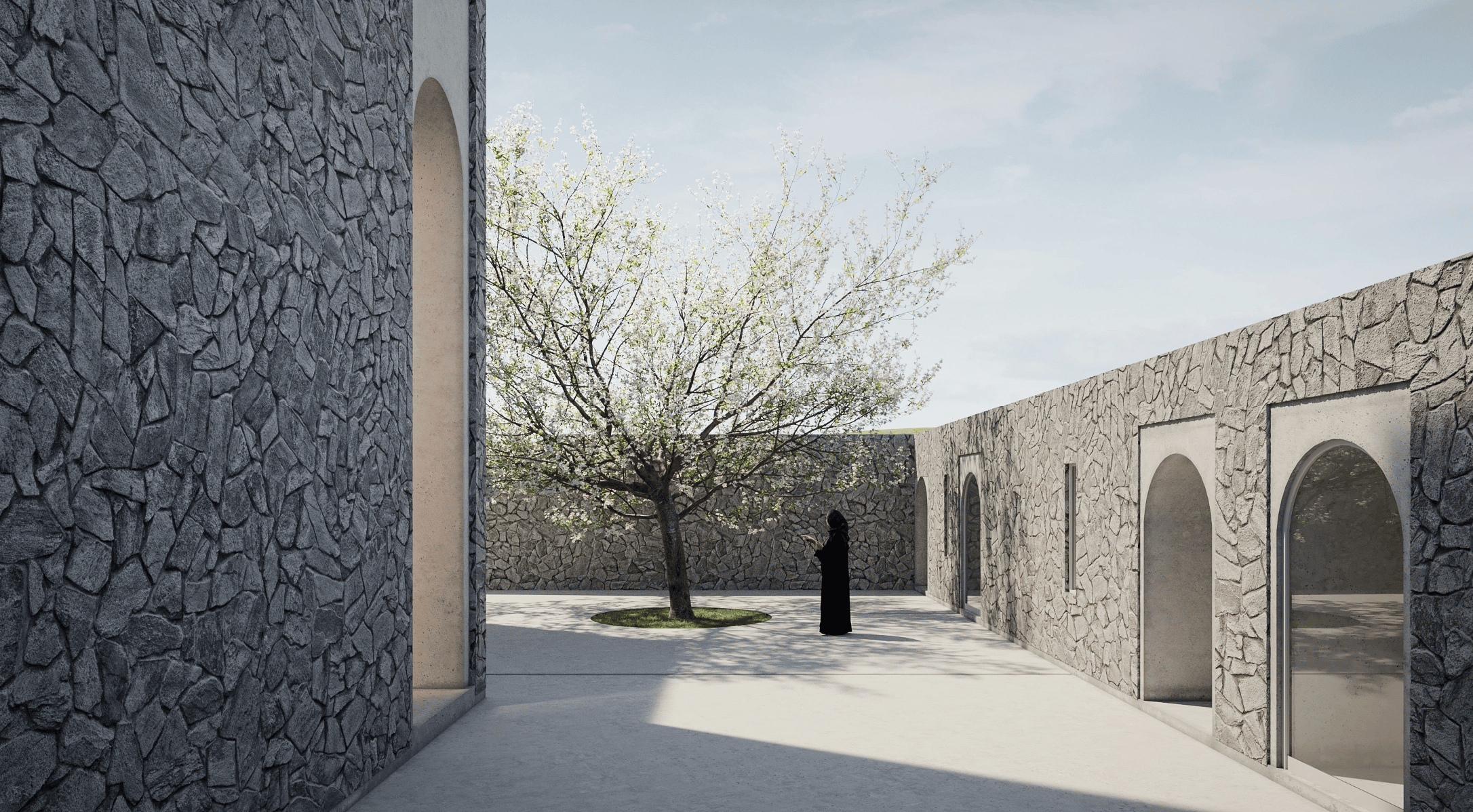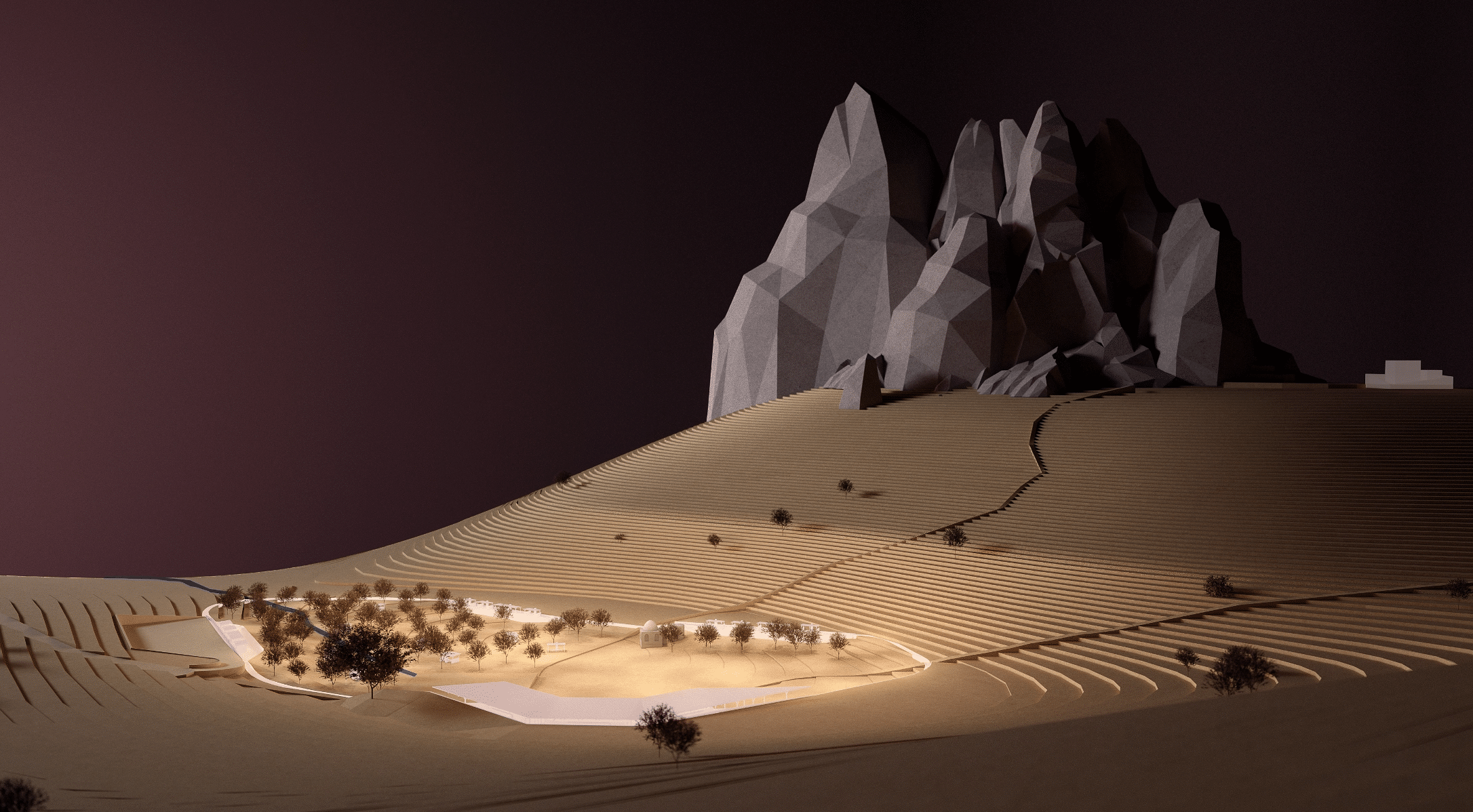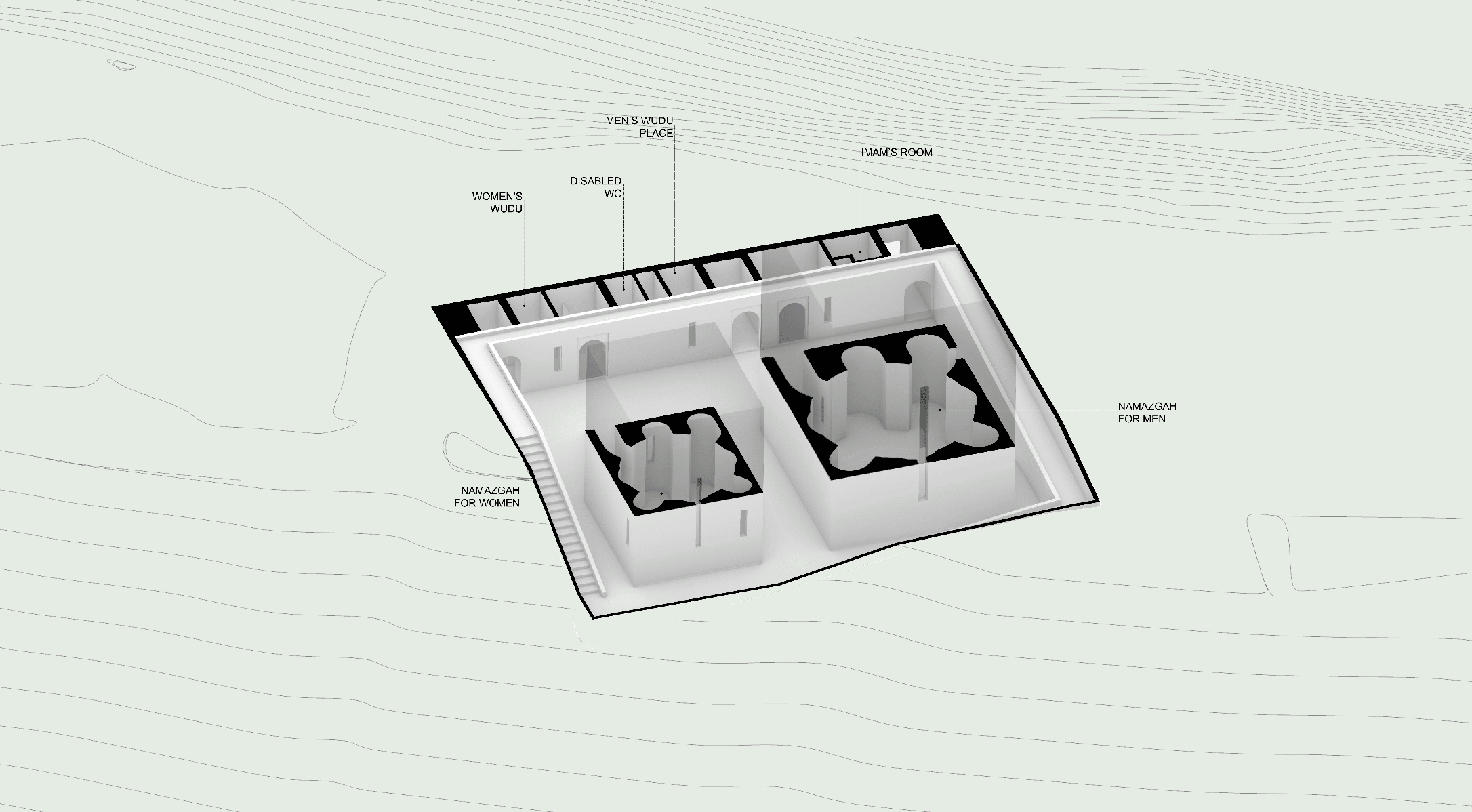 Halfway between the settlement and the peak, it is planned to build a mosque, a place for praying. Showing respect to nature and the ancient holy place, the mosque will be created in an aesthetic and minimalist way, using local stone as a building material. For men and women there are intended to be similar prayer rooms (Namazgah), which from the outside are formed by stretched cubes (a reference to the Kaaba in Mecca), but inside are classic prayer rooms with cupola ceilings and niches. The space of the priest (Imam), as well as the areas for washing (wudu), are hidden in the landscape. The space around the cubes is laid out as a recessed courtyard, the perimeter of which is made up by steps and ramps, ensuring access to the surrounding area for people.