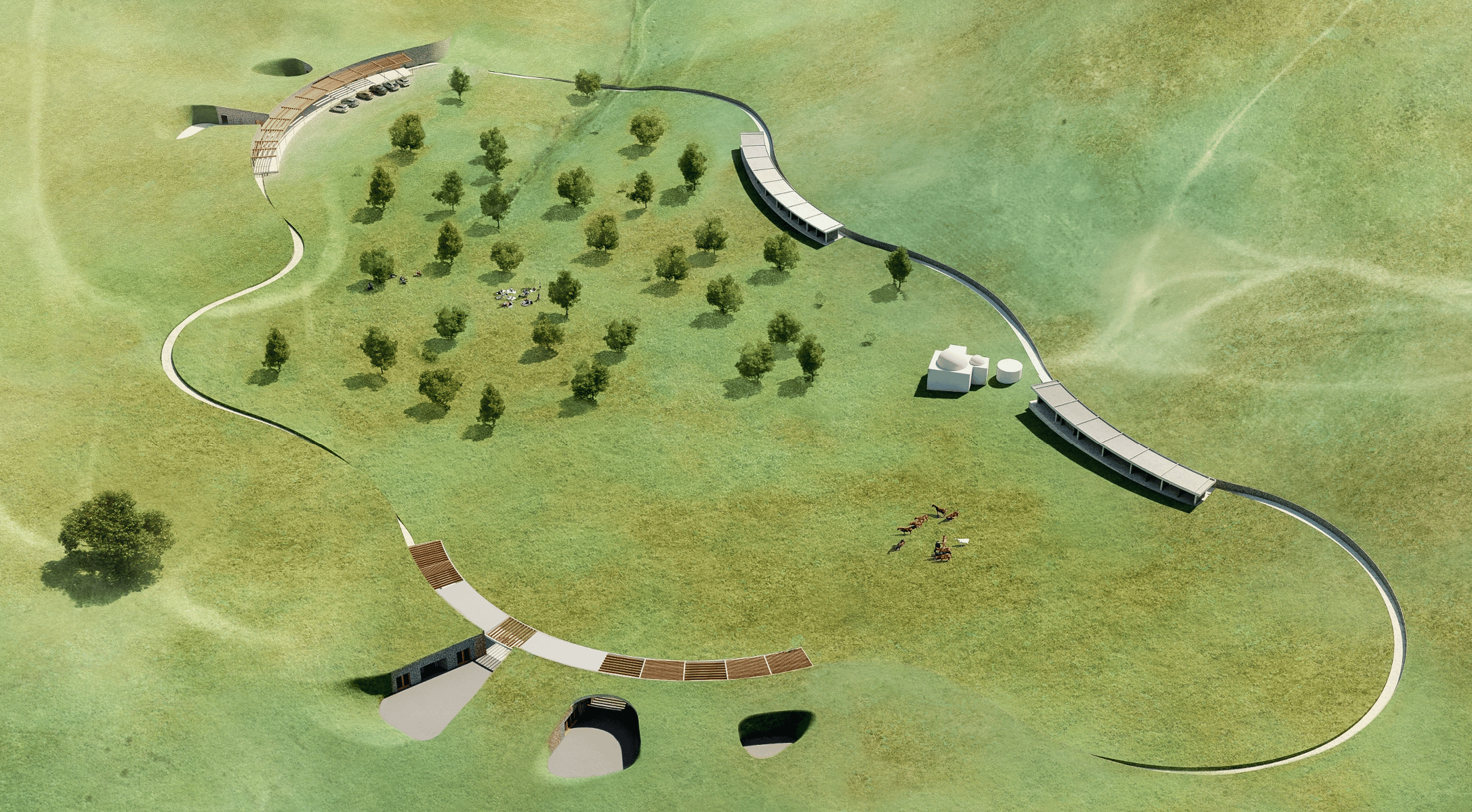 In order for the buildings, which are a spatial extension of the retaining wall, to blend into the landscape and not damage the view, they are constructed from local stone as single-storey units with green roofs. Rainwater collected from the drainage system will be used to water trees. The project is also intended to renovate the existing spring in order to guarantee clean and free drinking water for guests. In the central part of the field, where there is more moisture, it is planned to plant around a hundred wild pear trees. In the field there will also be an area intended for horse riding and a children’s playground.