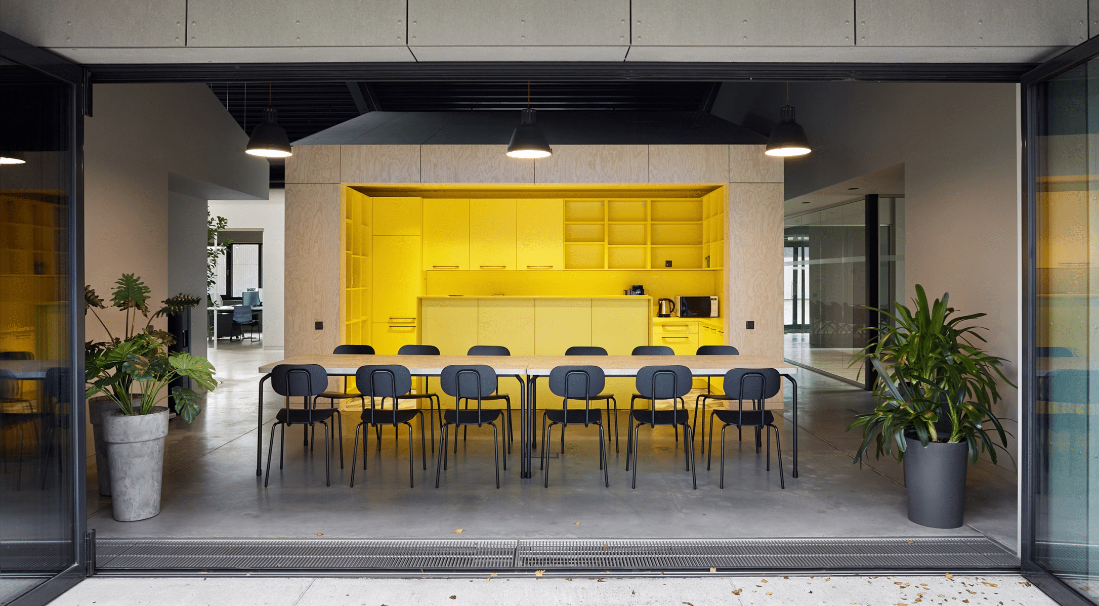Functionally, the building has all the components necessary for a modern office. Inside, there are spaces for discussion of different sizes, a space for quiet work, a relaxation space, a games area, a kitchen with a fresh juice bar and a dining area with a terrace. The multi-faceted nature of the spaces promotes worker productivity.