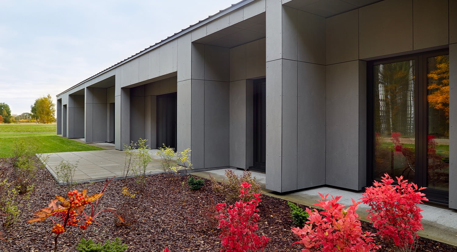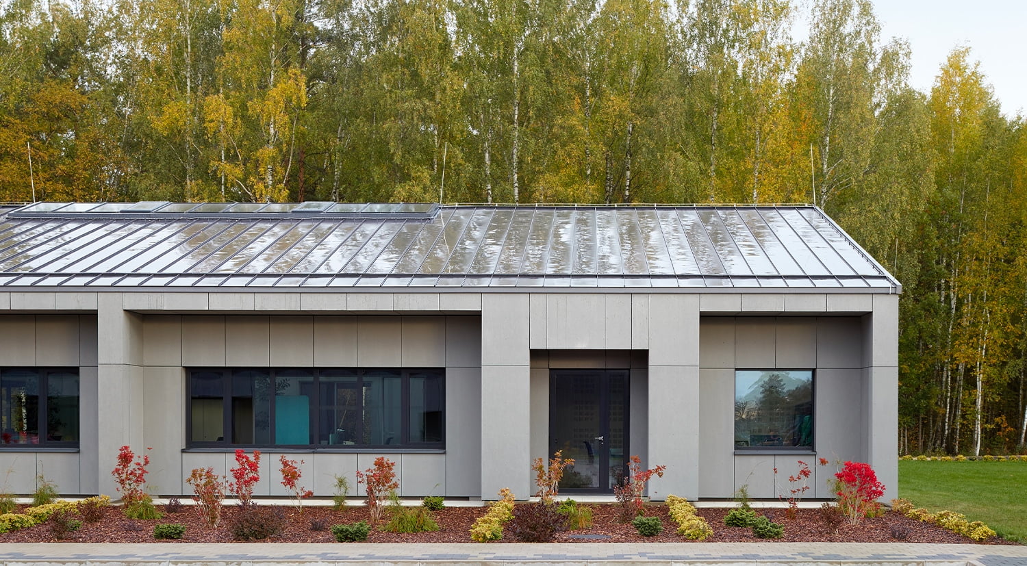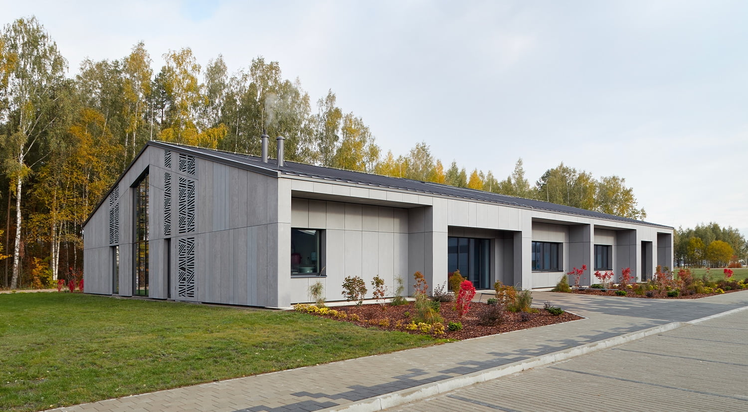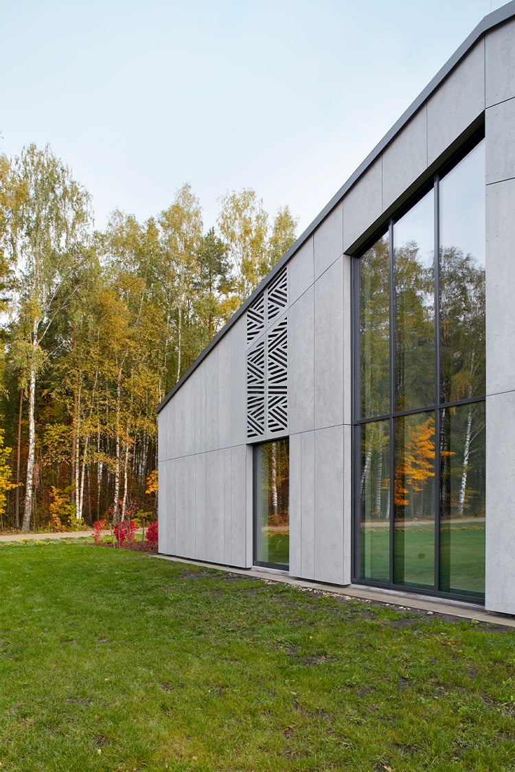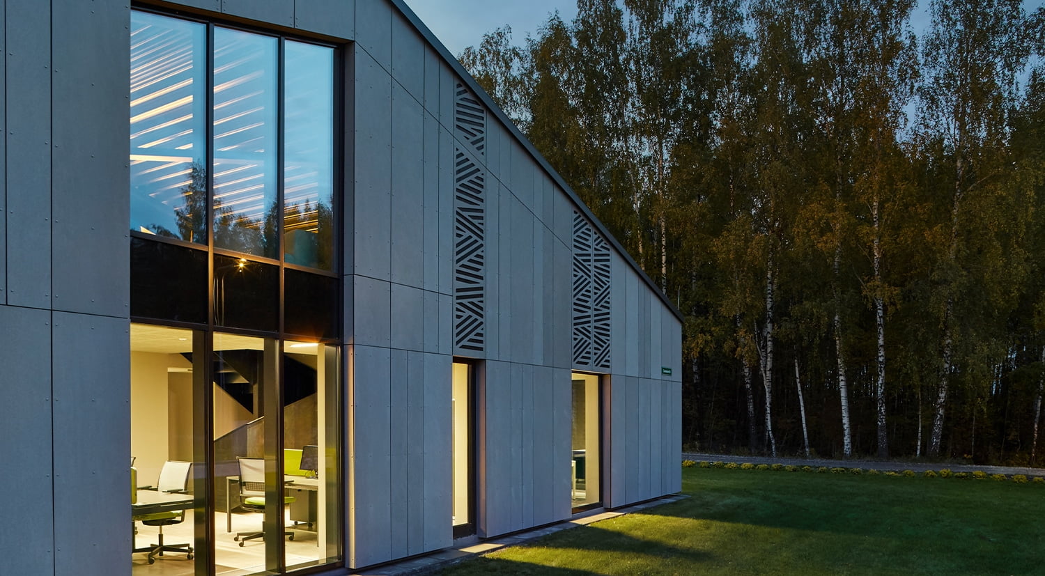 The facade of the building is trimmed with fibre cement boards. In order to reduce consumption of materials, small plate cuttings are used in the finish. The perforated plates in the facade conceal the pipes used for the supply of fresh air and the removal of stale air, as well as the cooling equipment. In the facade, windows of different sizes are used, making the building more closed-off to the public courtyard with car parking spaces, but more open to the forest. The roof overhangs and niches create a small outdoor terrace, as well as shielding the workspaces from direct sunlight.