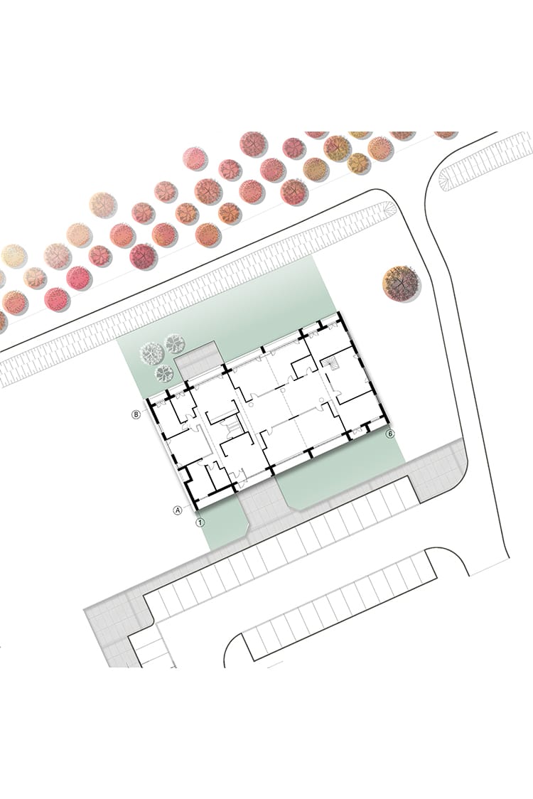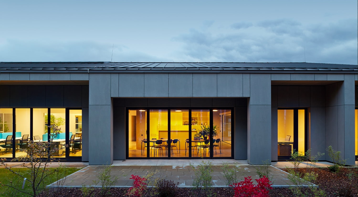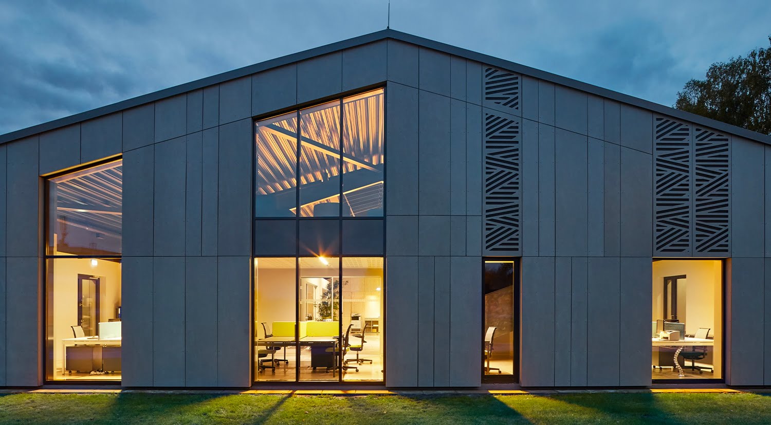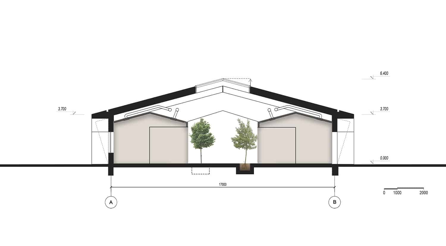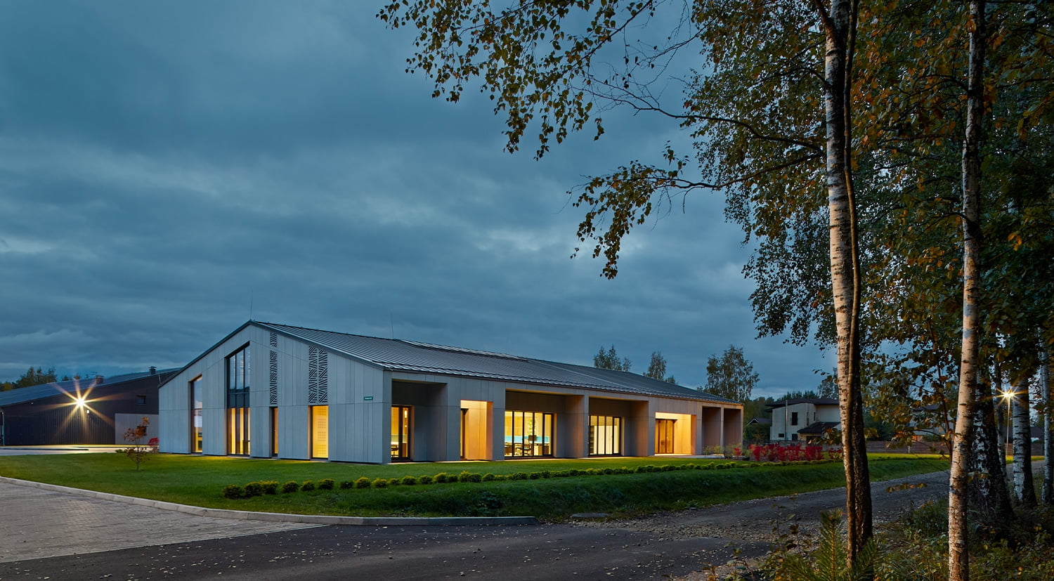 The small office building has been built in a typical suburban environment between an industrial area and a birch wood. The simple, hangar-like building blends into the surrounding landscape and it is realised with a limited budget. The building structure is formed by large spans without columns, which allows free rein in terms of the division of the internal space, the height, and lightness of the space. In order to blur the borders between the indoor and outdoor space, the surrounding nature and forests, large indoor plants are placed in the space.