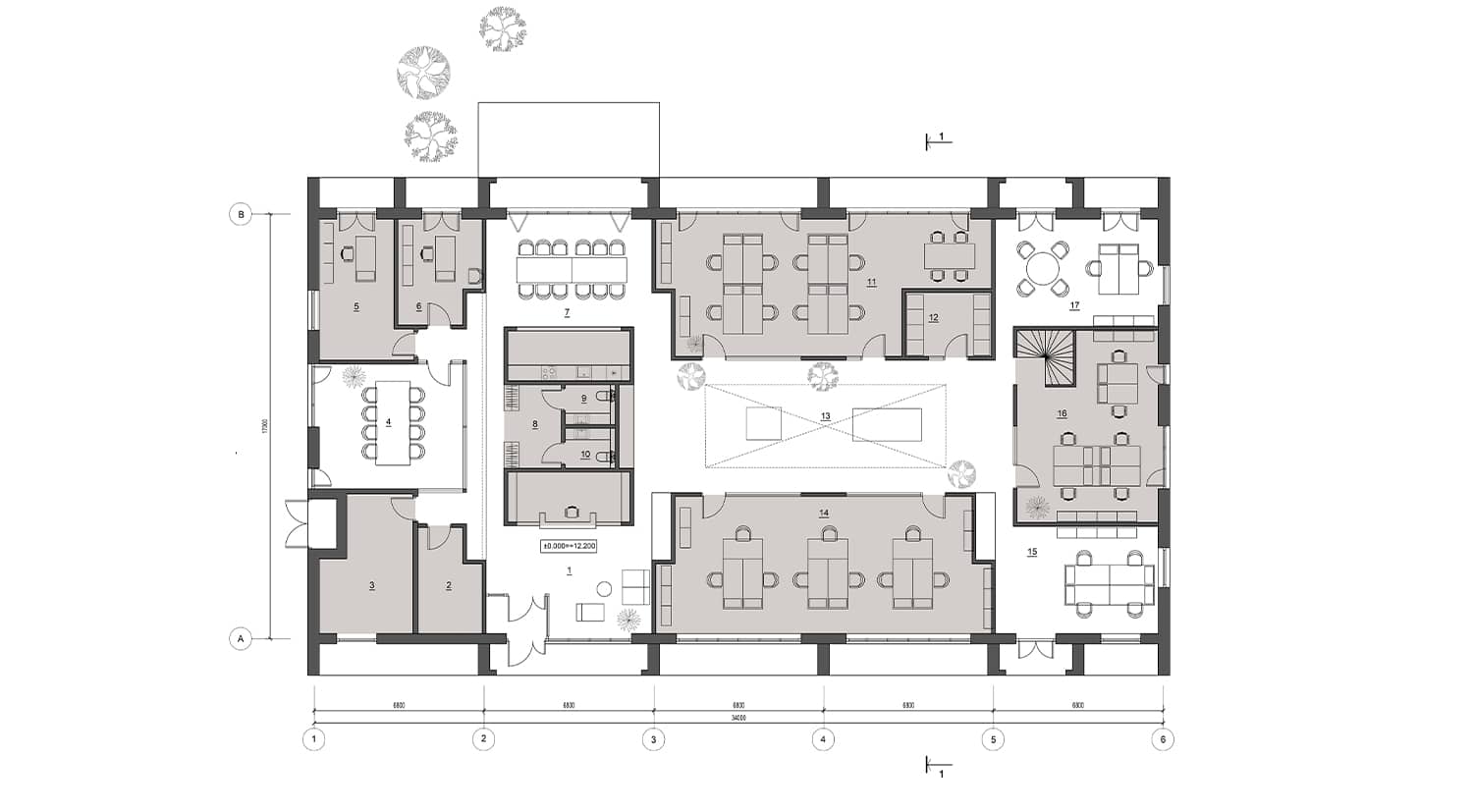 The structure of the office building is made up of different sections or “little houses”, and the spaces between them, which can be used for different functions – exchange of ideas, quick discussions and other activities where a great deal of concentration is not necessary. All the “little houses” have a glass wall and door, which allows them to be connected with other spaces to create a large open office. This principle of an office that can be partially opened up and mutually linked allows for varied use of the space.